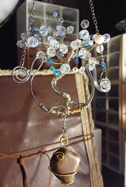 The roots of the tree curl naturally around the frame, grounding the piece in ancient energy… and from these roots hangs a powerful Earthstone, wrapped in golden spirals.