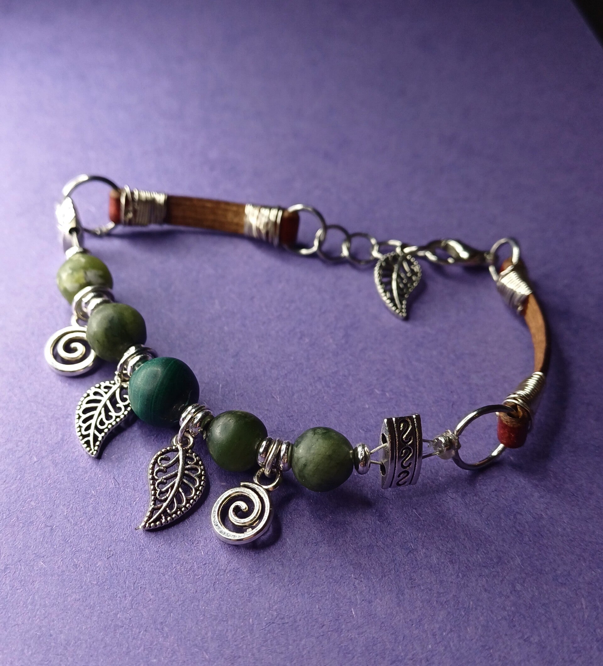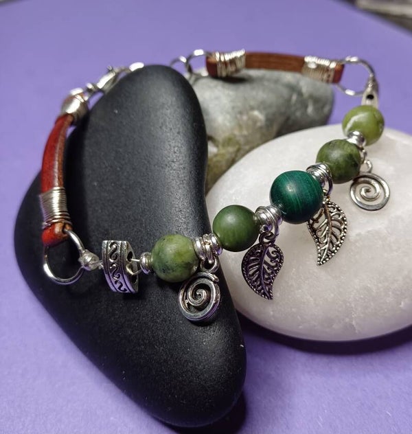This bracelet brings together earthy green stones - symbols of growth, wealth, and renewal - with silver charms that carry ancient energy. The deep emerald tones echo forest magic and fertile ground, where prosperity quietly takes root.