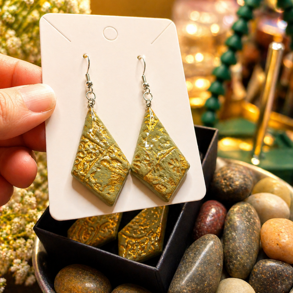 Handmade polymer clay earrings shimmering with golden patterns and ancient mystical energy. Their warm glow carries confidence, creativity, and a touch of sunlit magic. Silver-plated copper hooks.