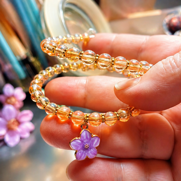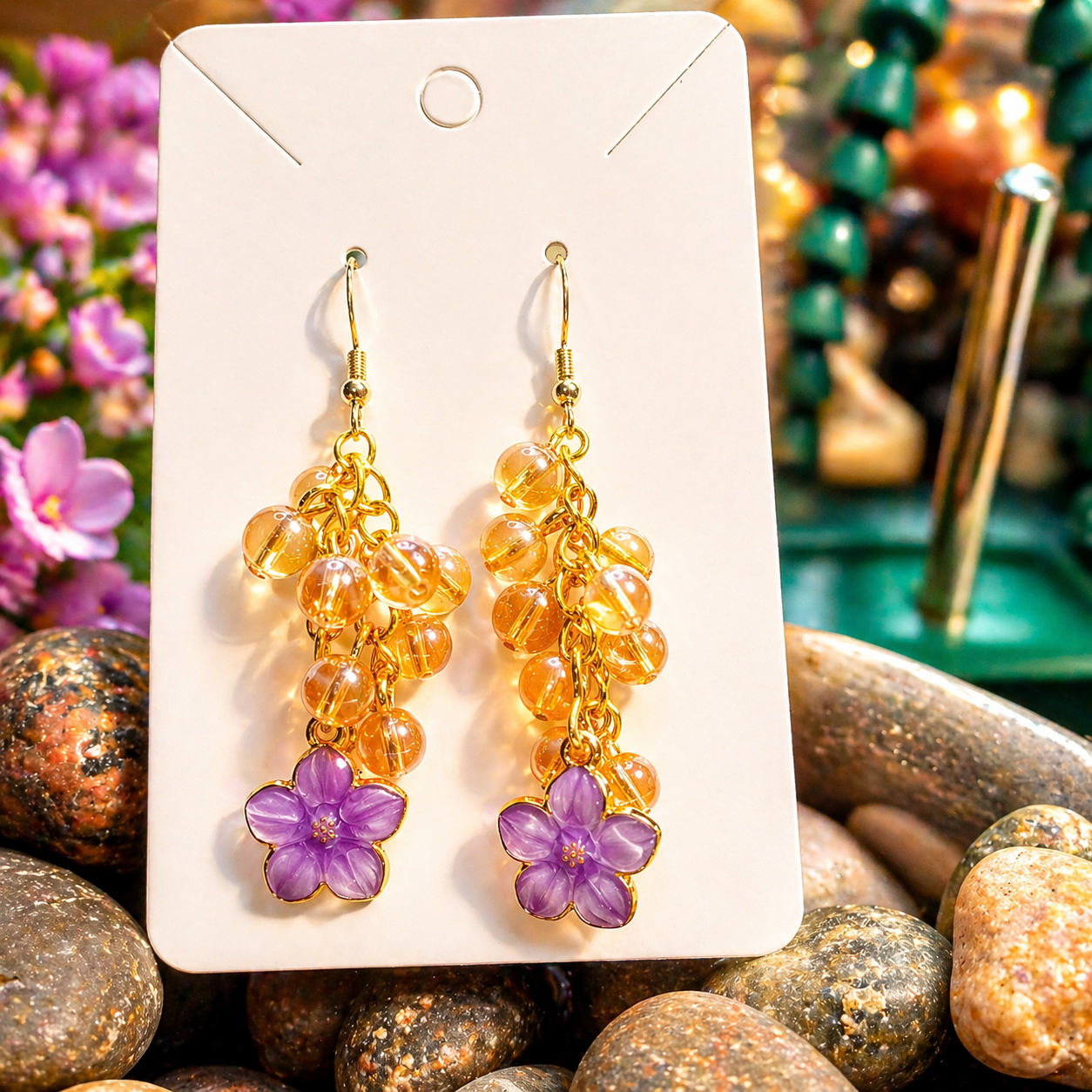 Sparkling golden beads and soft lilac blossoms create a joyful, elegant energy full of warmth and light. Bracelet and earrings handmade with silver-plated copper hooks.